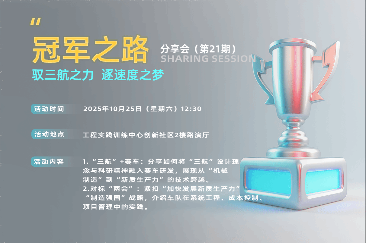 紧扣两会关于“加快发展新质生产力”与“制造强国”的时代强音,分享车队如何践行“天下工大,世界三航”的使命愿景;涵盖赛事备战中的系统工程思维、成本控制与项目管理,以及如何在商业营销答辩与赛道实战中,培养具备国际视野、能够解决复杂工程问题的“总师型”人才,为国家“三航”事业输送栋梁之才。